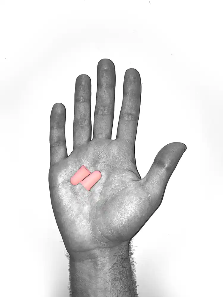 The earplug, which is made of compressible foam or silicone, deforms under pressure, but slowly expands, exerting force on the contours of my ears, which bear a strong resemblance to those of my grandfather. The shape, which is slightly more pronounced at certain angles, reinforces the feeling that the earplug is pressing into the soft folds of my skin and not fitting properly. Its fit therefore depends on how well it clings to my inner ear to form the temporary barrier that promises harmonious quietness.