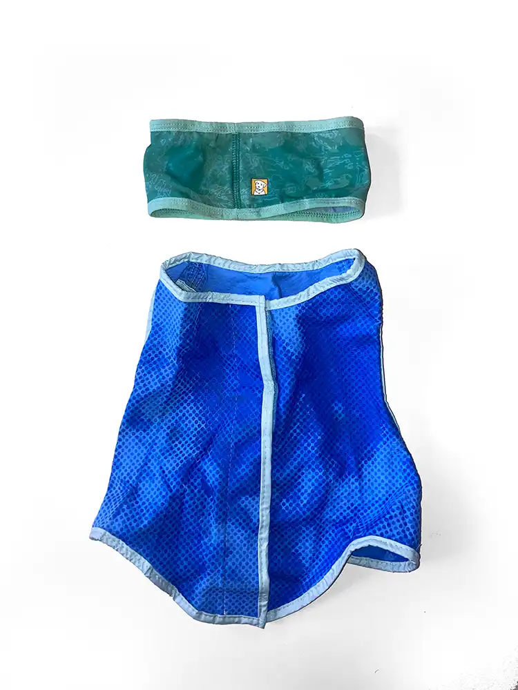 Like many urban pet dogs, Orion lives embedded in a modernist urbanism where spaces of separated and different airs shape cities. On the one hand, indoor bubbles provide cooling, humidifying, purifying, and an atmosphere of thermal comfort. The outdoors, on the other hand, are spaces of exposure to the unfiltered, elemental forces of weather, where one needs to protect oneself from sun, rain, wind, and cold. While devices designed for humans, like hats or sunglasses, were never really adapted for canine customers, the market for clothing with the function of sponge coolers attached to a body quickly became a multispecies one. At the end of Summer 2023, Orion also became a proud owner of a cooling jacket and a cooling collar, pieces of cloth made of slowly drying microfiber and polyester. They are soaked in cold water, put on the dog before exposing him to the heat of the city, and keep him cool while wandering around outside of the well-modulated bubbles of indoor thermal comfort.