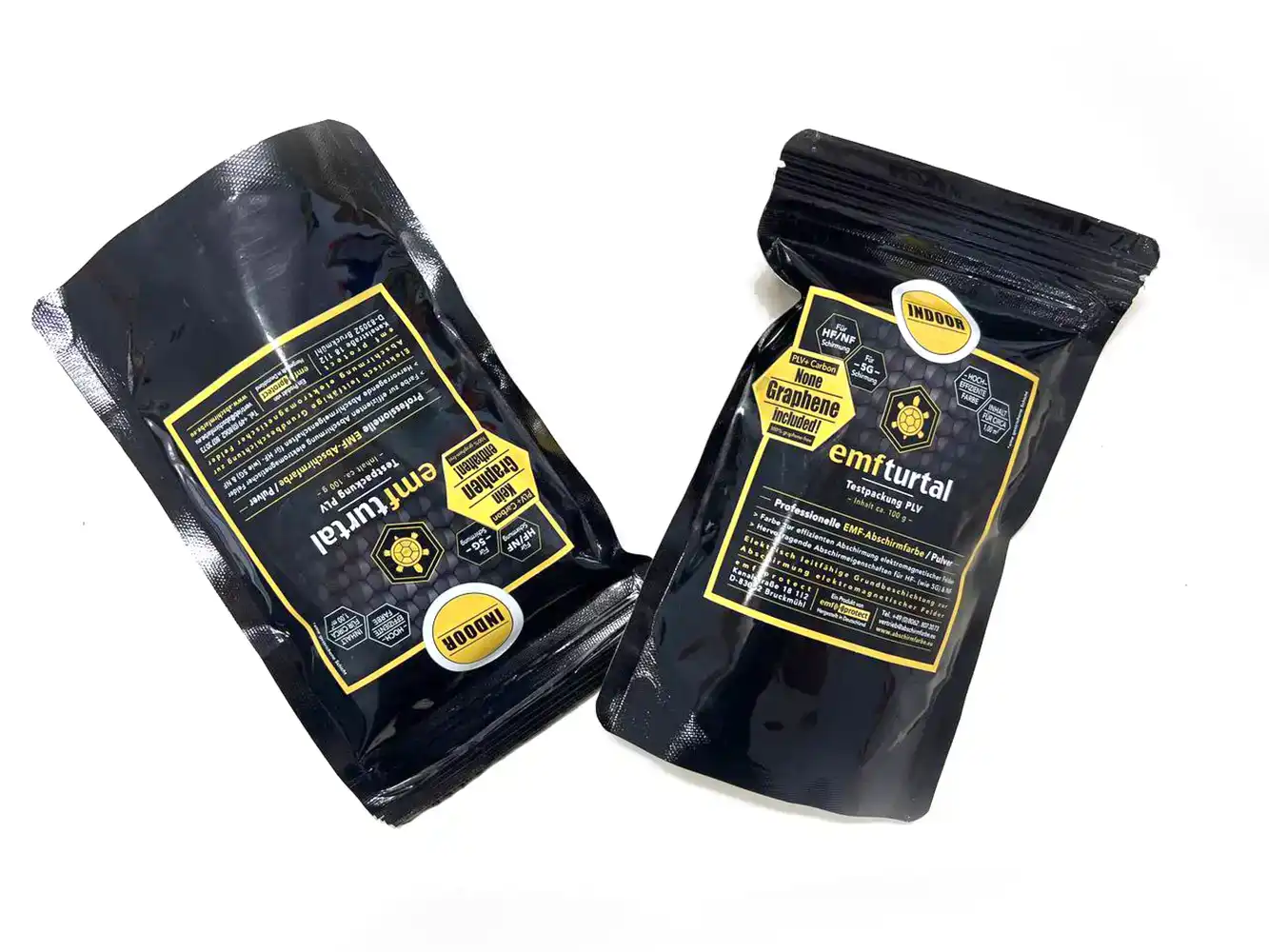 ‘EMF turtal’ is a black powder. The instruction for application reads: ‘Mix a 100g test pack with 170ml of water and stir until there are no lumps. After mixing, let it stand for about 10-15 minutes and then stir again briefly. The paint can then be used. Important! Always use a paint roller with a short fleece to apply! Do not use a foam roller! The surface to be painted should always be primed and dust-free!’