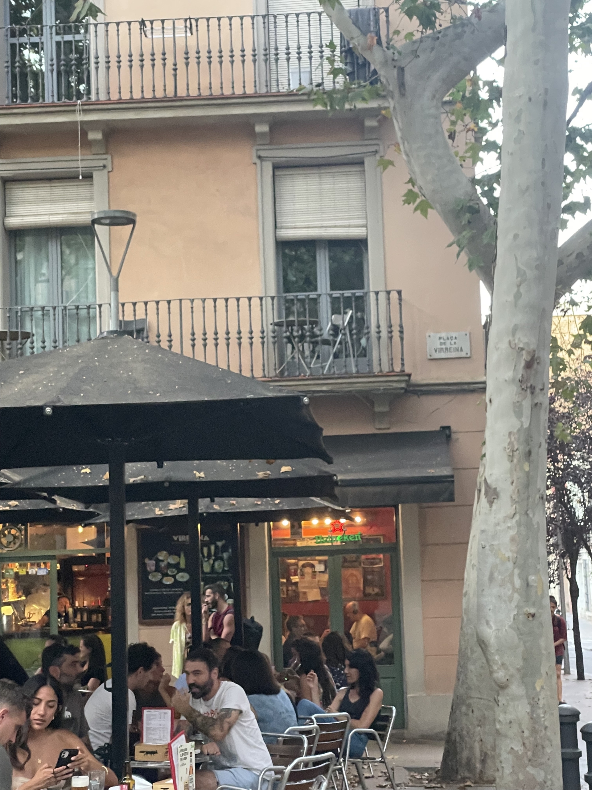 the busy restaurant and the balcony overhead (and the open windows nearby)